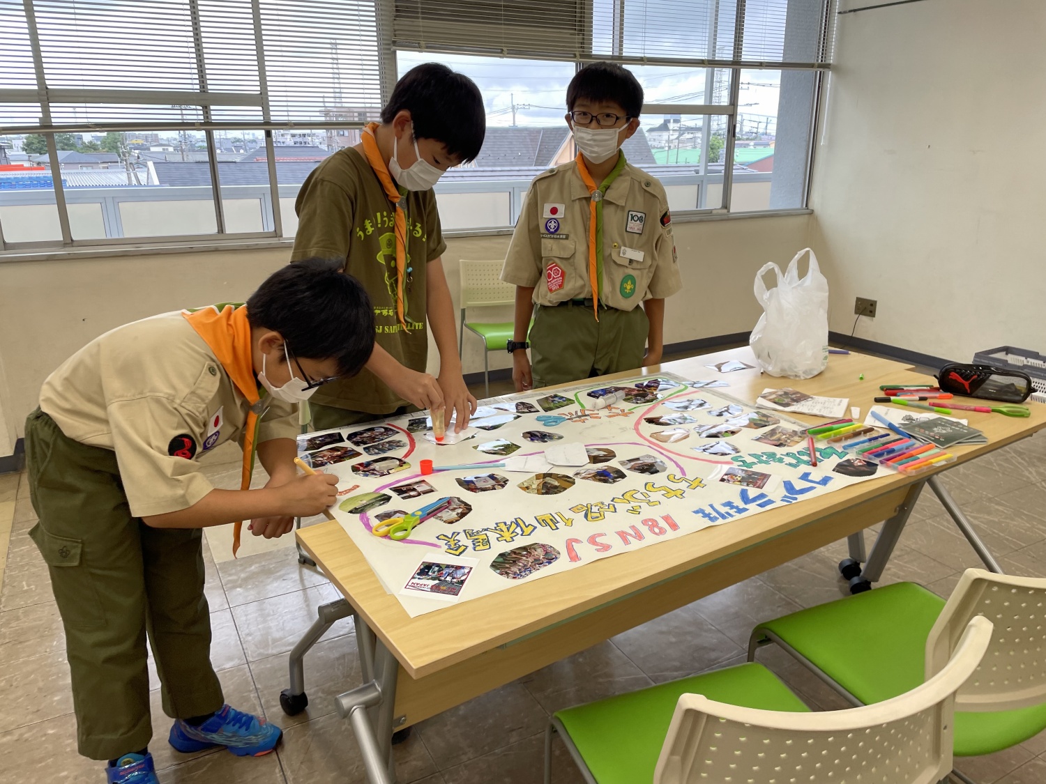 振り返りは写真を準備し、支援してくれた団や保護者に報告するための模造紙発表の作成を行いました。