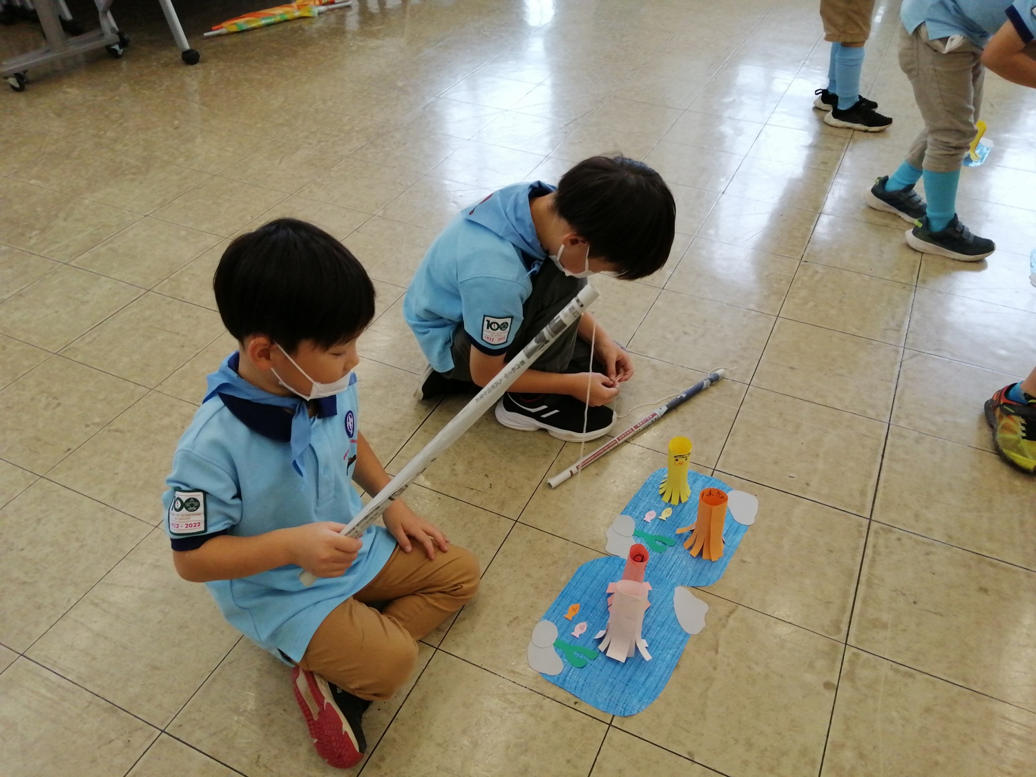 その後は新聞紙で竿を作り、クリップを釣り針にしてたこ釣りをしました。