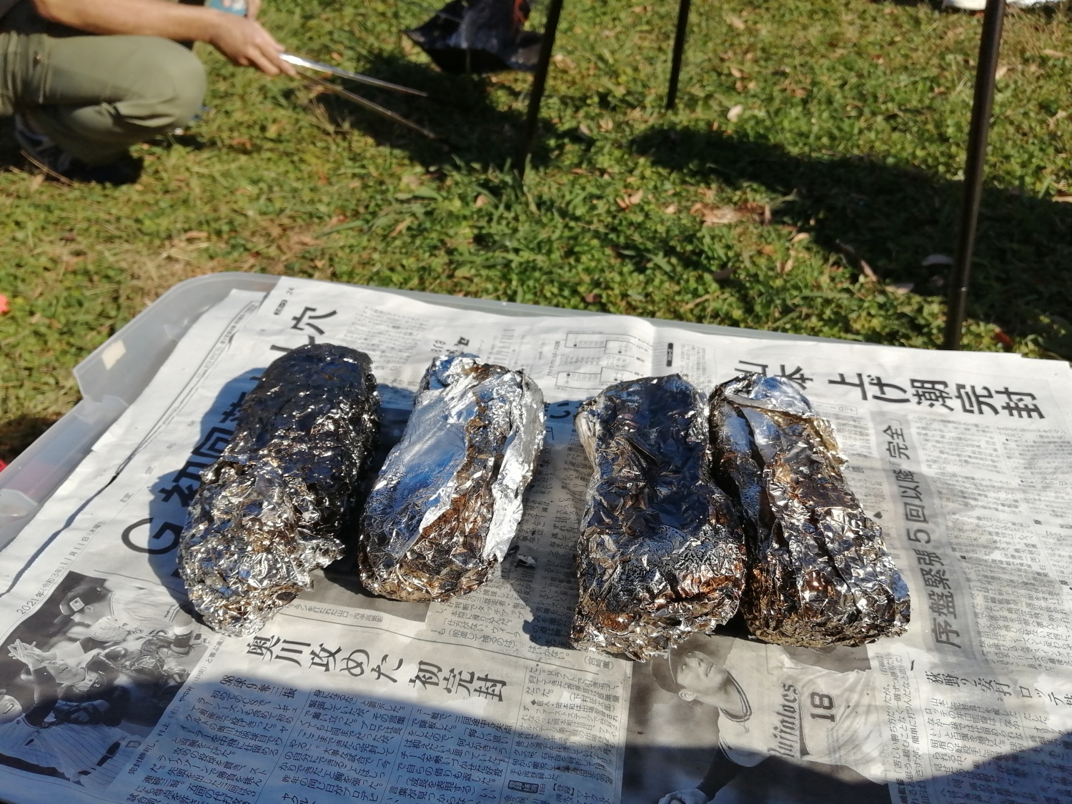 農園で掘ったサツマイモを焼いて食べる予定が雨天のため中止になりました。しかし、あきらめきれなかったリーダーはサツマイモを新たに買って焼き芋をしました。