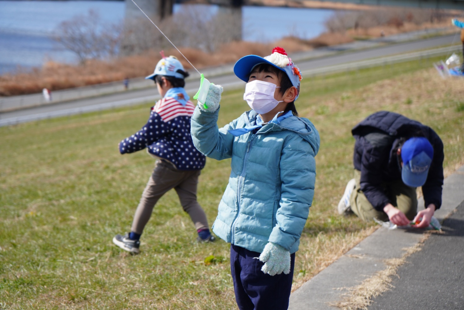 まず室内でビニール袋を材料に手作り凧を制作し、その後は土手で凧あげをしました。