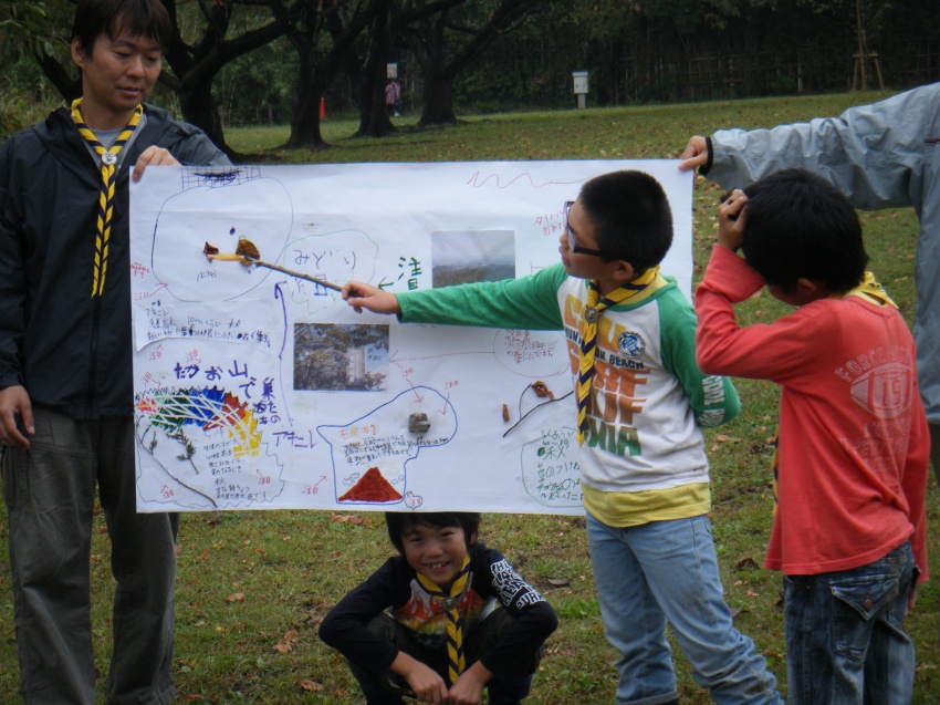 道満で隊キャンプを行いました。前半は雨に見舞われましたが、その後無事晴れました。高尾山で収穫した自然物の発表や、すのこ作り、追跡サイン作り等を行いました。