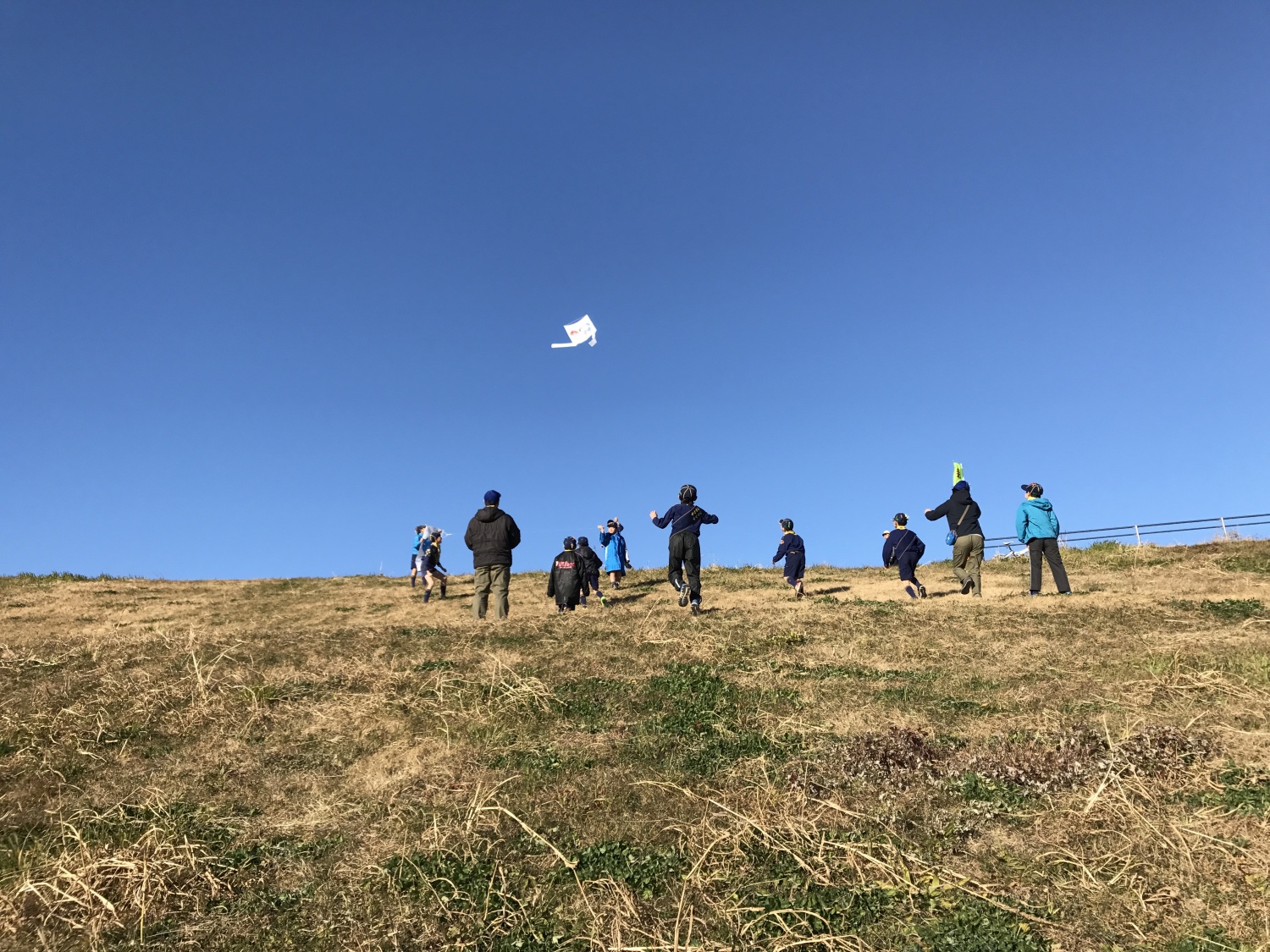 『午前の組集会では和凧作りをしました。組で、大きな凧をひとつ作る共同作業です。障子紙を使い、願いを込めた絵を描き、竹ひごを使い骨組みをし、糸と両面テープで留めました。 午後は荒川土手での隊集会。 みんなでに力を合わせて完成した凧を揚げました。各組の凧は澄み切った1月の空へとても高く上がり、楽しい集会となりました。』