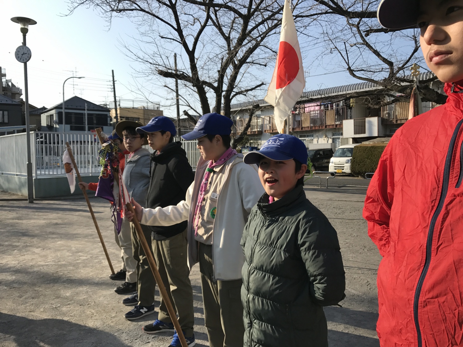 お天気 快晴!の日曜日、第3回 月の輪集会を戸田市中町多目的広場で行いました。この日は、月の輪習得課目の国旗の正しい扱い方、計測、ローピングなどを履修しました。 皆、BS隊の活動に慣れてきたかな?