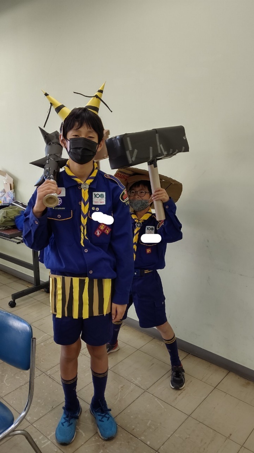 小道具などを作りました。今年のテーマは妖怪大戦争なので、スカウトたちは